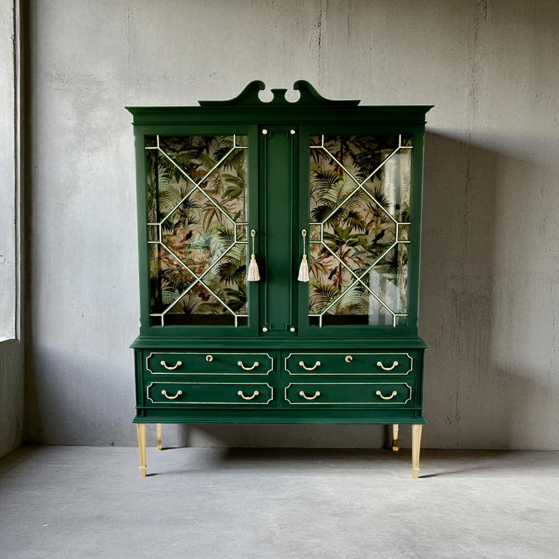 Maak kennis met deze exclusieve vitrinekast, volledig met de hand gerestyled in een rijke diepgroene kleur met elegante goudkleurige accenten. De kast combineert klassiek vakmanschap met een moderne twist dankzij de opvallende botanische print aan de binnenzijde. De glasdeuren met sierlijke roedeverdeling zorgen voor een luxueuze uitstraling, terwijl de kwastgrepen en messing look details het geheel afmaken.