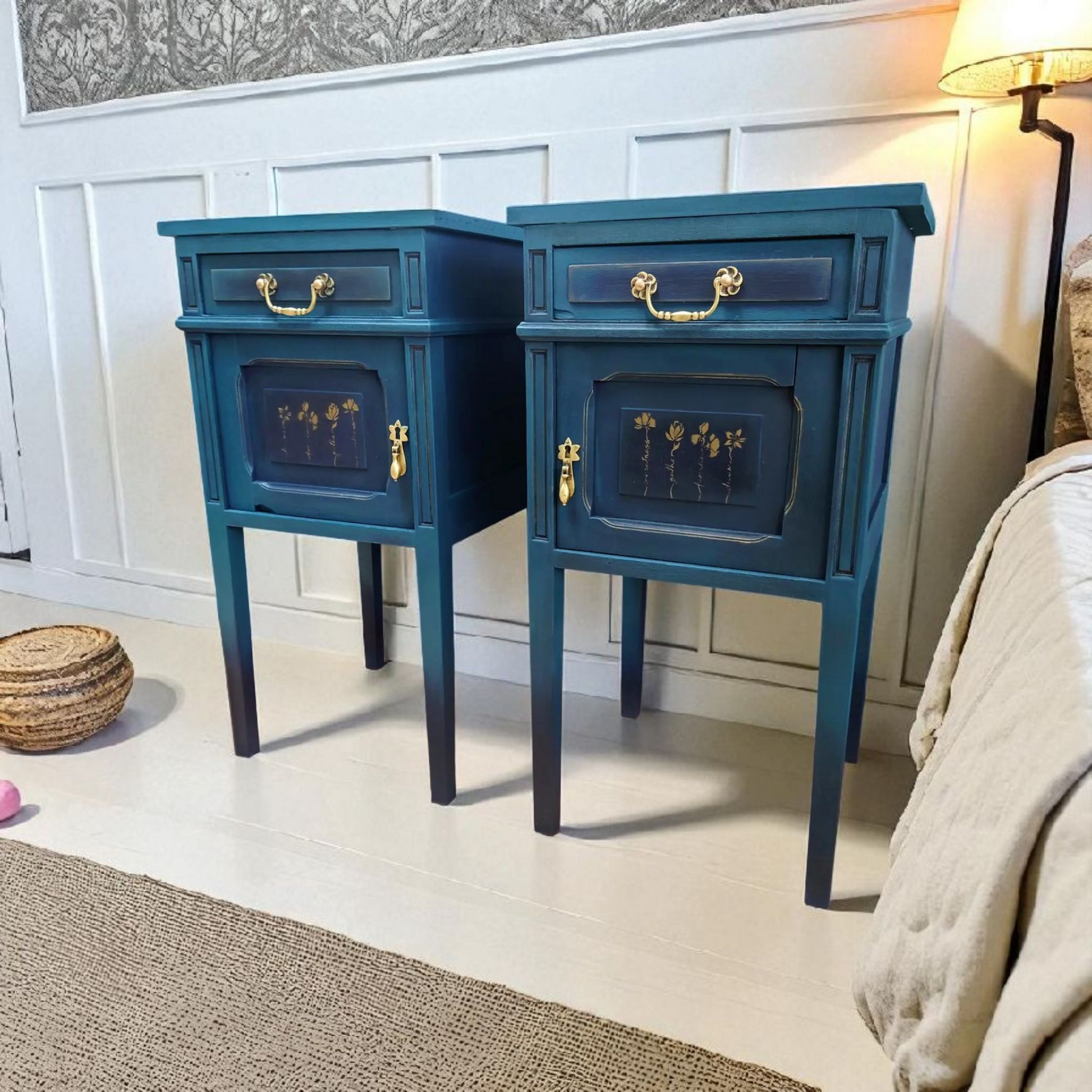 De Midnight Blossom Nachtkastjes brengen elegantie en verfijning in je slaapkamer. Deze set van twee hoge nachtkastjes is uitgevoerd in een diepe blauwgroene kleur met subtiele ombre-effecten richting de poten. De gouden details – van de sierlijke handgrepen tot de bloemaccenten op de deurtjes – zorgen voor een luxueuze uitstraling met een vleugje romantiek.