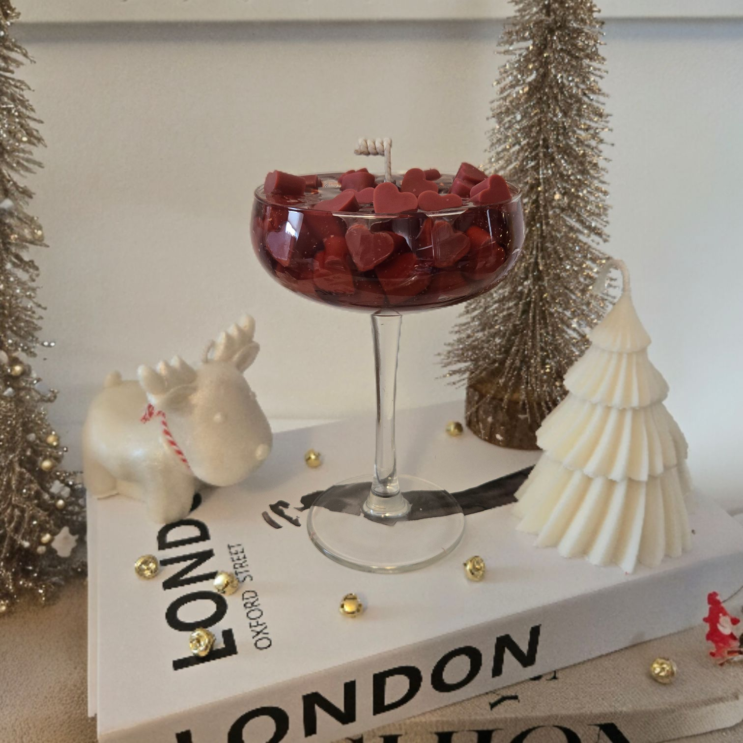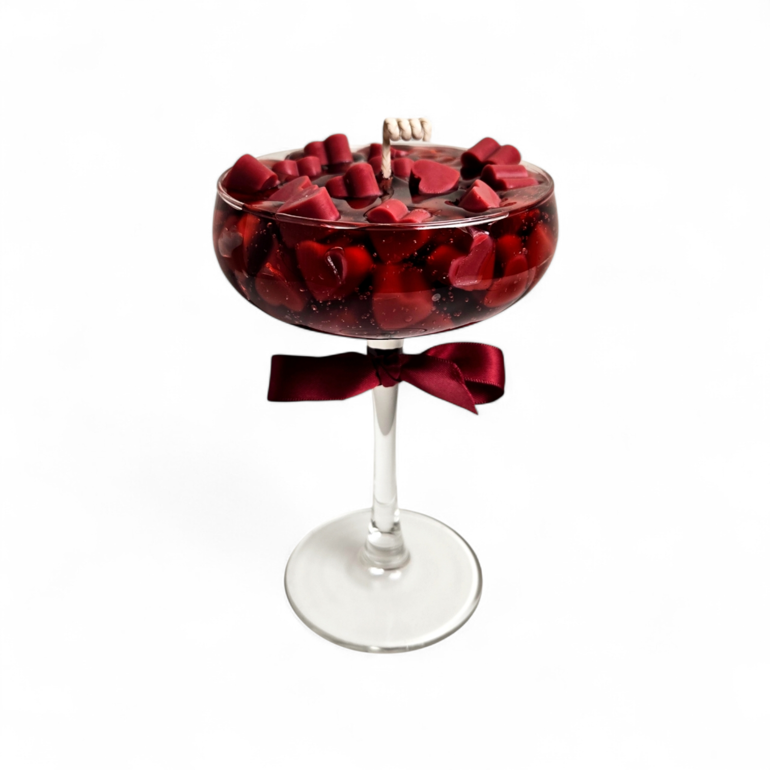 Breng warmte en elegantie in huis met onze “Red Hearts” cocktailkaars, handgemaakt uit een luxe mix van duurzame sojawas en heldere gelwax. Deze unieke kaars wordt gegoten in een stijlvolle coupeglas en versierd met charmante rode hartvormige wasdecoraties die langzaam smelten en een zachte gloed verspreiden.
